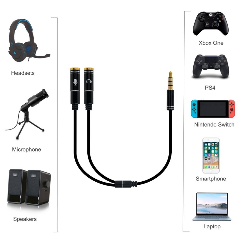 Ideal para conectar fones de ouvido e microfone a um dispositivo com uma única porta de áudio com conector 3.5mm. Compatível com muitos dispositivos como controlador, telefones, laptop, consola portátil, etc. Condutores de cobre de alta qualidade para uma excelente qualidade de áudio. Comprimento: 0.30m